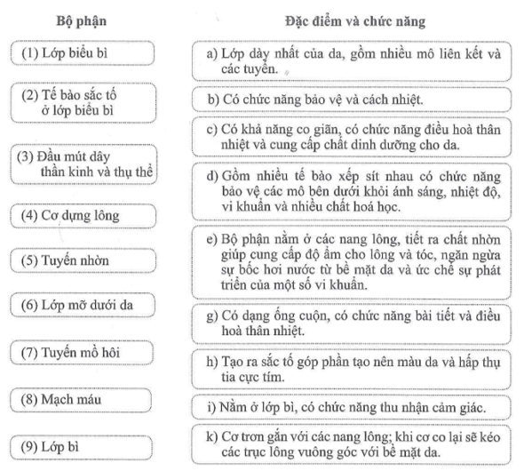 Bài 36.8 trang 73 Sách bài tập KHTN 8: Nối tên bộ phận với đặc điểm và chức năng tương ứng cho phù hợp.