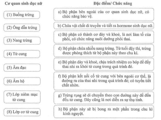 Bài 37.7 trang 75 Sách bài tập KHTN 8: Nối tên cơ quan sinh dục nữ với đặc điểm hoặc chức năng tương ứng
