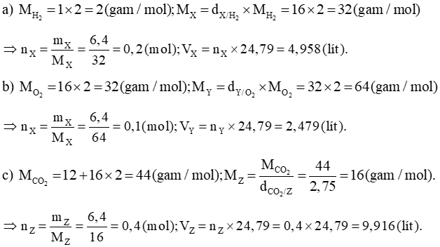 Bài 4.8 trang 15 Sách bài tập KHTN 8: Tính số mol và thể tích (ở đktc) của 6,4 gam các chất khí X Y và Z biết: