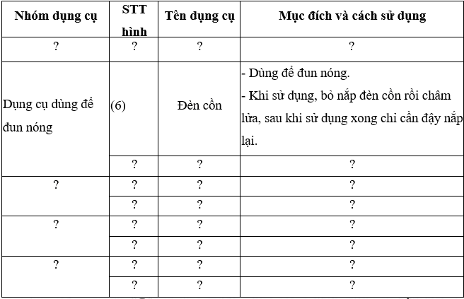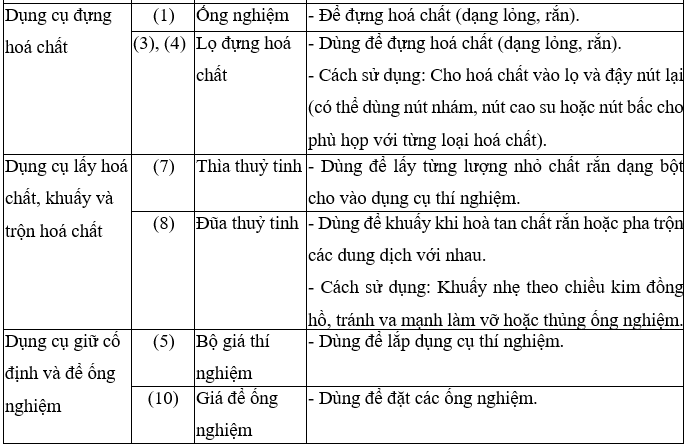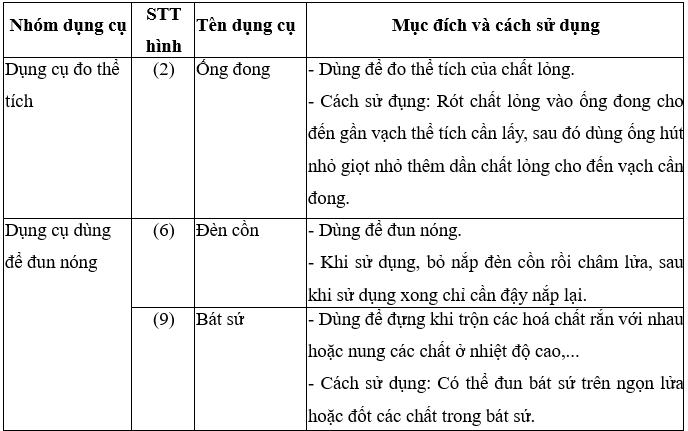 Bài 7 trang 4 Sách bài tập KHTN 8: Lựa chọn các dụng cụ được cho trong hình 1, sắp xếp theo nhóm, nêu tên, mục đích và cách sử dụng các dụng cụ đó theo bảng sau: