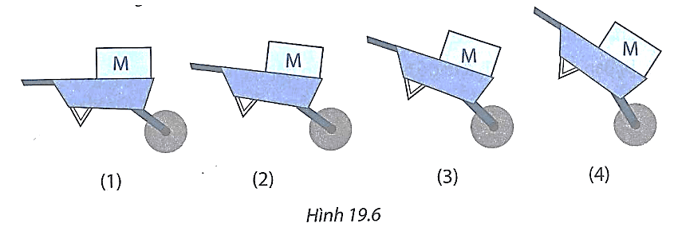 Tay cầm càng được nâng lên cao thì khoảng cách từ trục quay tới giá của lực càng dài tức cánh tay đòn càng dài giúp tác dụng của lực làm quay càng lớn thì khi đó lực nâng cần thiết của người càng nhỏ. Do đó, dùng xe cút kít dịch chuyển vật nặng (M) nên theo tư thế hình 19.6 (4).