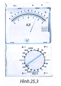 Bài 25.3 trang 67 Sách bài tập KHTN 8: Ampe kế đang để ở thang đo 0,6 A. Cường độ dòng điện đo được trong ampe kế ở hình 25.3 là: