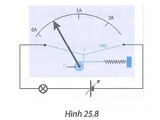 Khi đoạn kim loại HD nóng lên, nở ra, lò xo sẽ kéo quay kim làm kim lệch sang bên phải, dòng điện càng mạnh, sợi dây càng nóng, kim lệch càng nhiều.