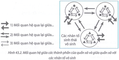 Bài 43.3 trang 105 Sách bài tập KHTN 8: Trong quần xã sinh vật, luôn có các mối quan hệ qua lại giữa các cá thể trong quần thể, giữa các quần thể với nhau và giữa các quần thể với các nhân tố sinh thái vô sinh (Hình 43.2). Hãy cho biết các mũi tên trong hình bên thể hiện mối quan hệ nào. Lấy ví dụ minh hoạ.