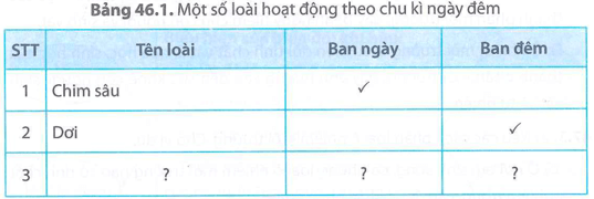 Bài 46.5 trang 111 Sách bài tập KHTN 8: a) Dựa vào Bảng 46.1, liệt kê thêm một số loài động vật hoạt động chủ yếu vào ban ngày và vào ban đêm.