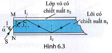 Lõi của một sợi quang hình trụ (Hình Bài 6.3) có chiết suất n1 = 1,5 và phần bọc ngoài có chiết suất n2=1,41. Tia sáng truyền đi bằng được trong sợi quang với góc tới α=29°.