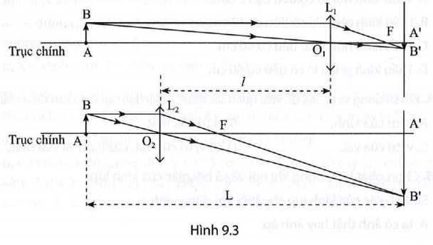 – Bước 1: Bố trí thí nghiệm như Hình Bài 9.1. Đặt vật và màn ảnh hai bên Thực hành đo tiêu cự của thấu kính hội tụ, cách Thực hành đo tiêu cự của thấu kính hội tụ một khoảng L > 4f, đo khoảng cách L. Giữ nguyên khoảng cách L, xê dịch Thực hành đo tiêu cự của thấu kính hội tụ trong khoảng giữa vật và màn ảnh cho đến khi thu được một ảnh rõ nét trên màn. Đánh dấu vị trí thứ nhất của Thực hành đo tiêu cự của thấu kính hội tụ (O1)