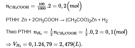 Bài 24.6 trang 65 Sách bài tập KHTN 9: Cho 100 mL dung dịch CH3COOH 2 M tác dụng hết với Zn thấy thoát ra V L khí H2 ở đkc. Tính V.