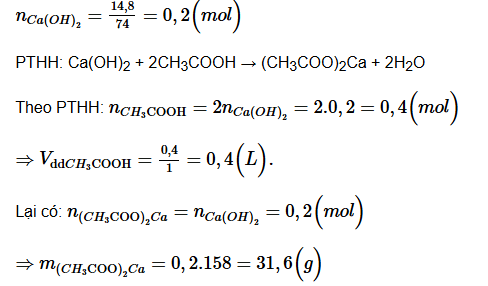 Bài 24.7 trang 65 Sách bài tập KHTN 9: Tính thể tích dung dịch CH3COOH 1 M cần dùng để tác dụng hết với 14,8 gam Ca(OH)2. Tính số gam (CH3COO)2Ca tạo thành.