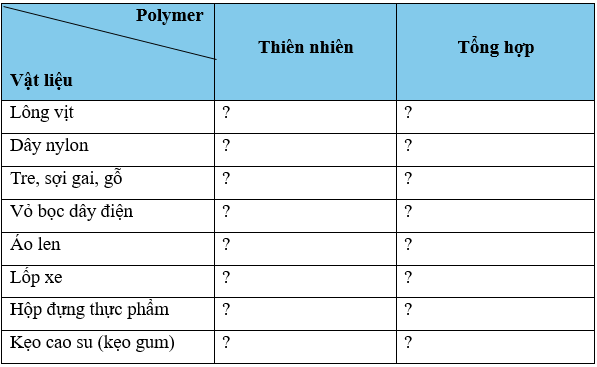 Câu 30.11 trang 87 Sách bài tập KHTN 9: Điền dấu (√) để hoàn thành bảng phân loại polymer theo mẫu sau: