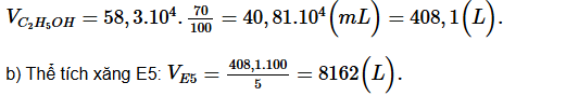 b) Lấy toàn bộ ethylic alcohol điều chế được ở trên để pha với xăng thông thường để sản xuất xăng E5.Tính thể tích xăng E5 thu được.