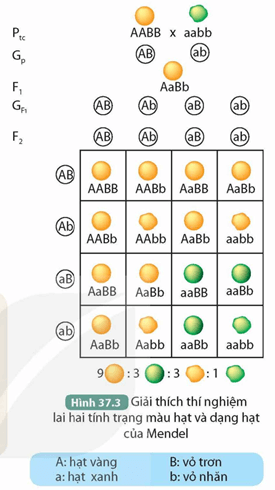 Bài 37.3 trang 99 Sách bài tập KHTN 9: Mendel cho lai giữa các giống đậu hà lan khác nhau về hai tính trạng (màu hạt và dạng hạt) tương phản, thuần chủng (phép lai hai tính trạng của Mendel trong SGK). Em hãy giải thích vì sao F2 thu được 4 kiểu hình với tỉ lệ 9 cây hạt vàng, vỏ trơn : 3 cây hạt vàng, vỏ nhăn : 3 cây hạt xanh, vỏ trơn : 1 cây hạt xanh, vỏ nhăn.