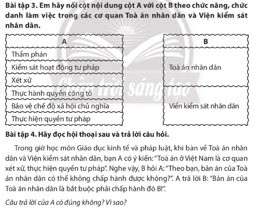 Bài tập 3 trang 99 SBT Kinh tế Pháp luật 10: Em hãy nối nội dung của cột A với cột B theo chức năng, chức danh làm việc trong các cơ quan tòa án nhân dân và Viện kiểm sát nhân dân