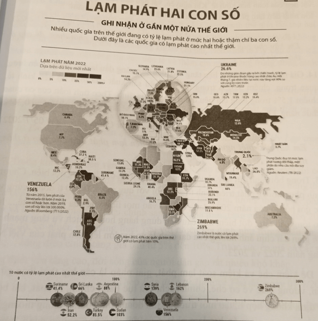 Thông tin. Năm 2022, do gián đoạn về nguồn cung khiến giá cả tiêu dùng leo thang, kết quả là gần 50% quốc gia trên thế giới ghi nhận lạm phát ở mức từ hai con số trở lên. Biểu đồ thông tin dưới đây thể hiện những quốc gia có lạm phát cao nhất thế giới. Trên toàn cầu, Zimbabwe, Lebanon và Venezuela là ba nước có lạm phát cao nhất, lần lượt là 269%, 162% và 156%.