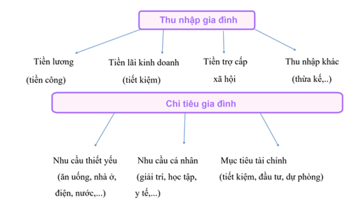 a) Từ thông tin trên, em hãy vẽ sơ đồ mô tả các khoản thu nhập và các khoản chi tiêu trong gia đình.