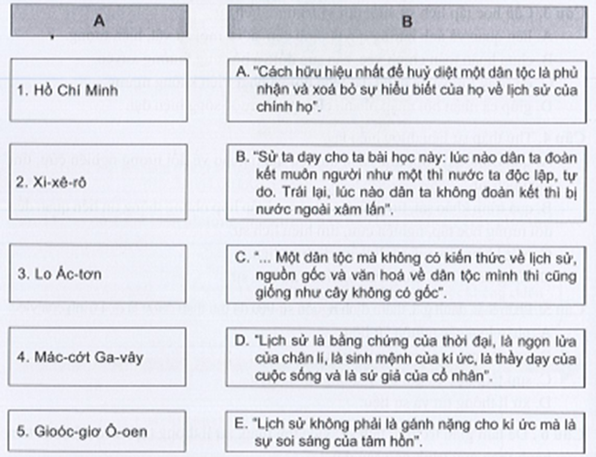 Câu 8 trang 8 SBT Lịch sử 10: Nối nhân vật ở cột A với câu nói viết ở cột B sao cho đúng.
