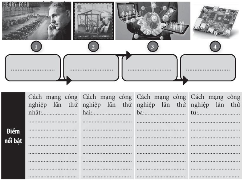 Bài tập 4 trang 72 SBT Lịch sử 10: Sắp xếp các hình dưới đây theo đúng tiến trình phát triển của 4 cuộc cách mạng công nghiệp trên thế giới. Nêu điểm nổi bật của từng cuộc cách mạng này.