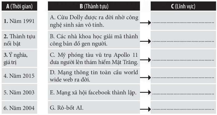 Bài tập 5 trang 72 SBT Lịch sử 10: Hãy nối thời gian ở cột A cho phù hợp với thành tựu cách mạng công nghiệp ở cột B và xác định thành tựu đó thuộc lĩnh vực nào ở cột C.