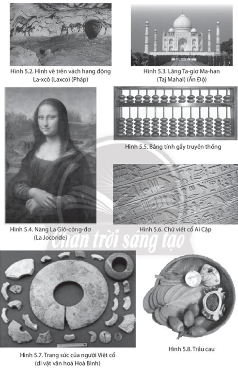 - Hình 5.2. Hình vẽ trên vách hang động La-xcô (Pháp). - Hình 5.3. Lăng Ta-giơ Ma-han (Ấn Độ) - Hình 5.4. Nàng La Giô-công-đơ - Hình 5.5 Bảng tính gẩy truyền thống - Hình 5.6. Chữ viết cổ Ai Cập - Hình 5.7. Trang sức của người Việt cổ - Hình 5.8. Trầu cau |