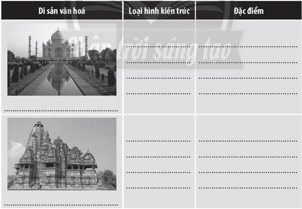 Bài tập 3 trang 43 SBT Lịch sử 10: Nêu tên các di sản văn hóa, lịch sử ở Ấn Độ được UNESCO ghi danh là di sản văn hóa thế giới. Xác định loại hình kiến trúc gắn với tôn giáo nào và đặc điểm nổi bật. Hoàn thành nội dung trả lời vào bảng dưới đây.