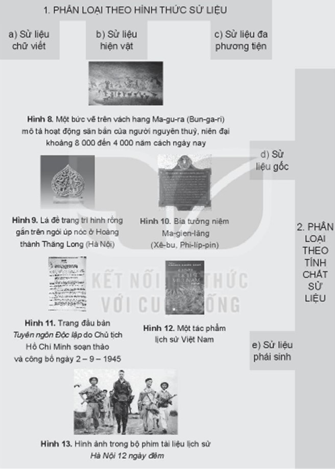 + Sử liệu chữ viết: Hình 10 (bia tưởng niệm Ma-gien-lăng), Hình 11 (trang đầu tiên bản Tuyên ngôn độc lập) , Hình 12 (một tác phẩm lịch sử Việt Nam)