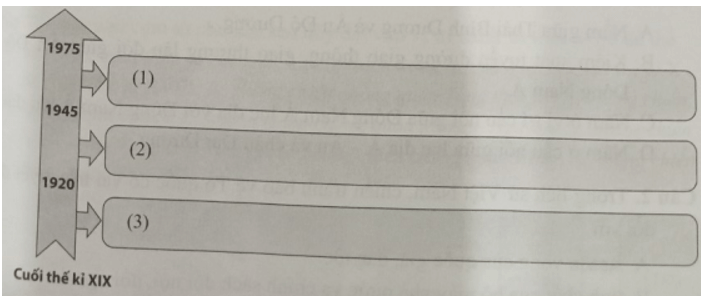 Câu 15 trang 23 SBT Lịch Sử 11: Chọn các câu cho sẵn sau đây đặt vào vị trí đánh số trên sơ đồ để thể hiện các giai đoạn phát triển của cuộc đấu tranh giành độc lập dân tộc ở Đông Nam Á từ cuối thế kỉ XIX đến năm 1975: