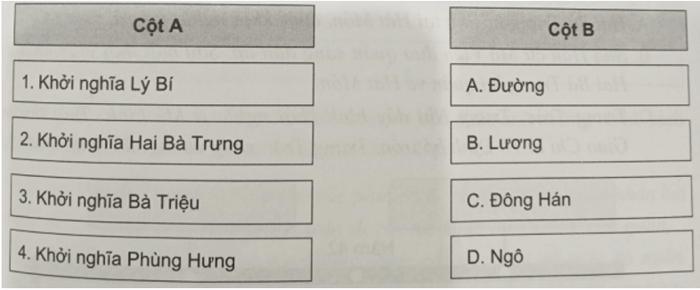 Câu 9 trang 33 SBT Lịch Sử 11: Ghép tên triều đại Trung Hoa ở cột B với tên cuộc khởi nghĩa tiêu biểu thời Bắc thuộc ở cột A sao cho đúng.
