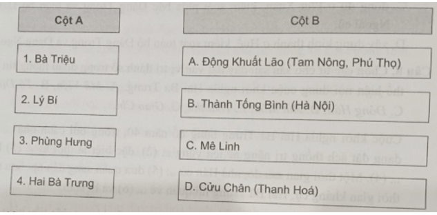 Câu 11 trang 34 SBT Lịch Sử 11: Ghép địa danh ở cột B với tên cuộc khởi nghĩa tiêu biểu trong thời kì Bắc thuộc ở cột A sao cho đúng.