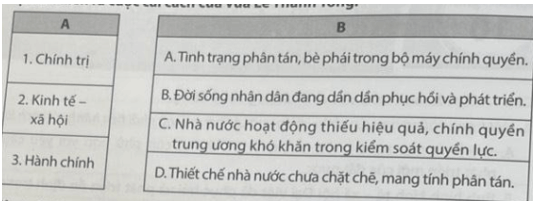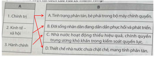 Câu 2 trang 46 SBT Lịch Sử 11: Nối các lĩnh vực ở cột A với thông tin ở cột B cho phù hợp về bối cảnh lịch sử diễn ra cuộc cải cách của vua Lê Thánh Tông.