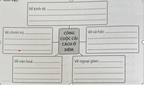 Câu 3 trang 22 SBT Lịch Sử 11: Hoàn thành sơ đồ về công cuộc cải cách ở Xiêm trên các lĩnh vực