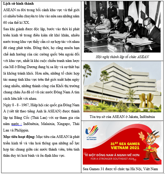 Câu 5 trang 25 SBT Lịch Sử 11: Chọn các cụm từ đã cho dưới đây và thiết kế một bài giới thiệu ngắn về hoàn cảnh ra đời và mục tiêu hoạt động của Hiệp hội các quốc gia Đông Nam Á (ASEAN).