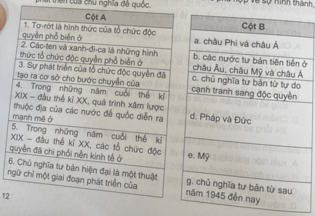 Bài tập 5 trang 12 SBT Lịch Sử 11: Ghép các ý ở cột A với các ý ở cột B sao cho phù hợp về sự hình thành, phát triển của chủ nghĩa đế quốc.