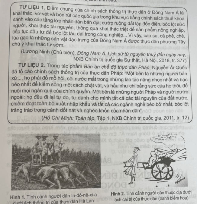 - Trong tư liệu 1: khai thác, vơ vét và bòn rút... bằng chính sách thuế khoá; cướp ruộng đất lập đồn điền, bóc lột sức người, khai thác tài nguyên; khai thác triệt để sản phẩm nông nghiệp, tiếp tục đầu tư để bóc lột lâu dài,...