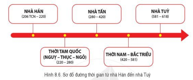 Câu 6 trang 17 sách bài tập Lịch Sử 6: Hãy đặt các từ ngữ cho sẵn vào các ô A, B, C, D, E để hoàn thành sơ đồ đường thời gian từ nhà Hán đến nhà Tùy: (1) Nhà Tấn (280 – 420); (2) Nhà Hán (206 TCN-220); (3) Thời Nam-Bắc triều (420 – 581); (4) Nhà Tùy (581-618); (5) Thời Tam Quốc (220 – 280).