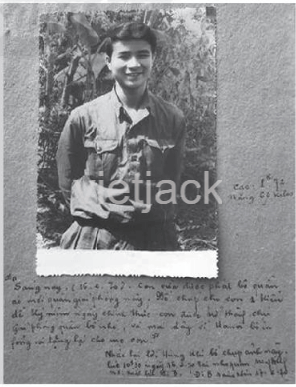 “Sáng nay, (16 - 2 - 1970). Con vừa được phát bộ quần áo mới quân Giải phóng này. Bố chụp cho con một kiểu để kỉ niệm ngày chính thức con được trở thành chú giải phóng quân bố nhé, và mai đây về Hà Nội, bố in phóng ra tặng lại cho mẹ con”.