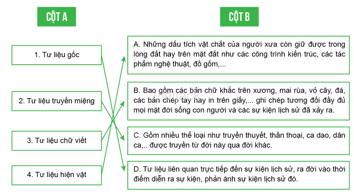 Câu 2 trang 6 sách bài tập Lịch Sử 6: Nối dữ liệu hai cột bên dưới để miêu tả được đặc điểm các nguồn sử liệu