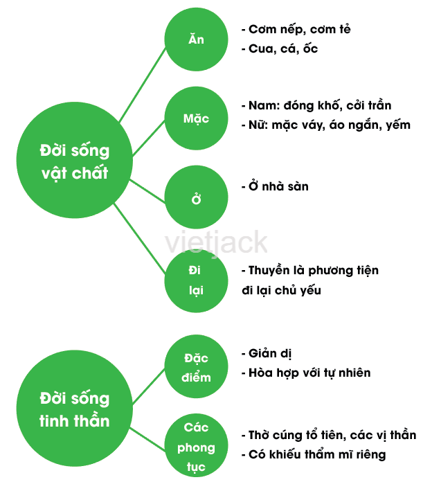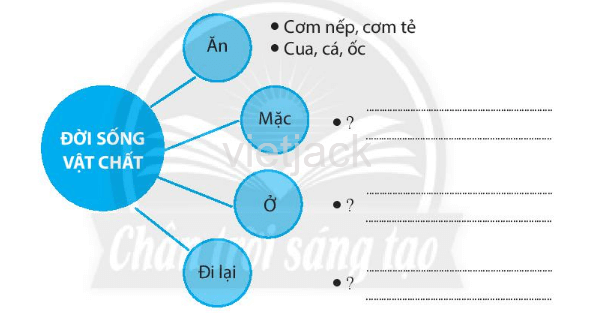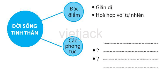Câu 2 trang 47 sách bài tập Lịch Sử 6: Hoàn thành sơ đồ tư duy theo mẫu bên dưới về đời sống vật chất và tinh thần của cư dân Văn Lang, Âu Lạc.