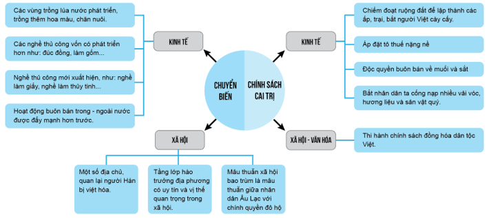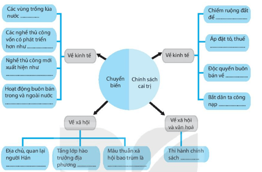 Câu 2 trang 46 sách bài tập Lịch Sử 6: Em hãy hoàn thành sơ đồ tư duy thể hiện các biện pháp cai trị về kinh tế, xã hội của chính quyền đô hộ phương Bắc cùng với những chuyển biến về kinh tế -xã hội của người Việt trong hơn một nghìn năm Bắc thuộc theo gợi ý sau: