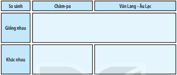 Câu 4 trang 57 sách bài tập Lịch Sử 6: Liên hệ với kiến thức đã học ở những bài trước, em hãy so sánh những điểm giống và khác nhau trong hoạt động kinh tế của cư dân Chăm-pa và cư dân Văn Lang - Âu Lạc theo bảng sau.