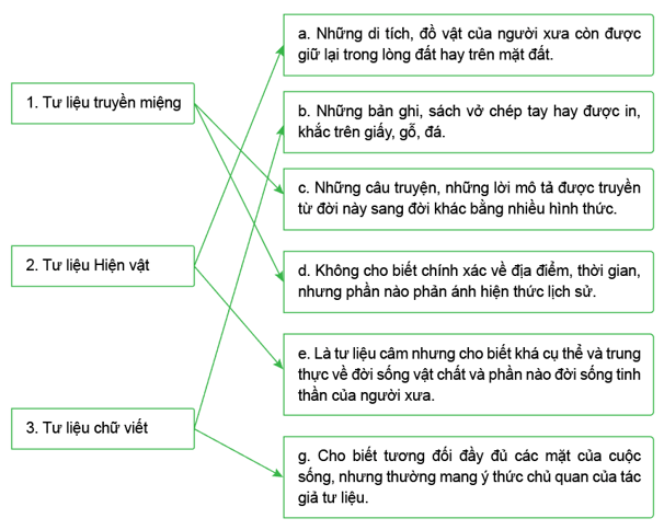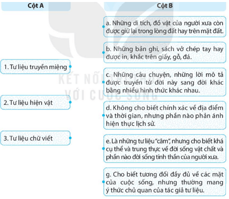 Câu 3 trang 8 sách bài tập Lịch Sử 6: Hãy ghép nguồn sử liệu ở cột A với khái niệm, ý nghĩa ở cột B sao cho phù hợp.