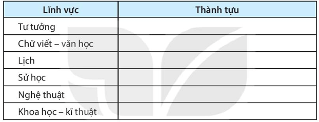 Câu 3 trang 29 sách bài tập Lịch Sử 6: Em hãy lập bảng tóm tắt những thành tựu văn hoá, khoa học - kĩ thuật của Trung Quốc đến thế kỉ VỊI theo mẫu sau.