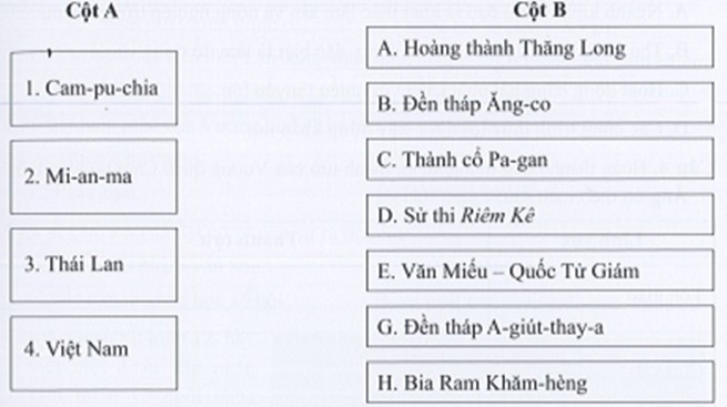 Câu 7 trang 23 SBT Lịch sử 7: Hãy ghép ô ở cột A với các ô ở cột B sao cho đúng về tên thước ở Đông Nam Á với một số thành tựu văn hoá tiêu biểu.
