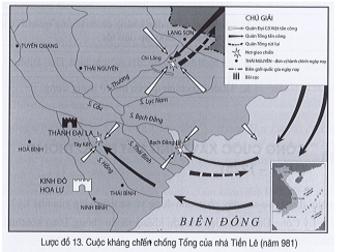 Câu 7 trang 27 SBT Lịch Sử 7: Quan sát lược đồ 13 và sắp xếp lại cho đúng thứ tự mô tả cuộc kháng chiến chống Tống của nhà Tiền Lê (năm 981).