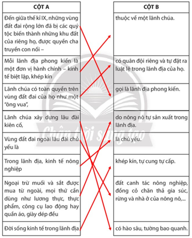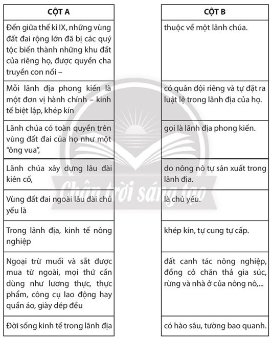 Bài tập 3 trang 7 SBT Lịch sử 7: Nối các dữ liệu ở cột A với dữ liệu ở cột B cho phù hợp để nêu được đặc điểm của lãnh địa phong kiến.