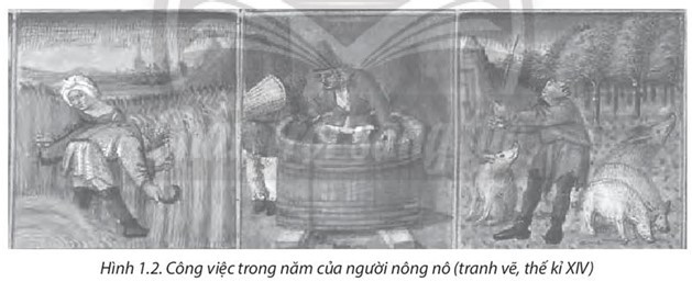 Bài tập 7 trang 9 SBT Lịch sử 7: Dưới đây là một số tranh vẽ có từ thế kỉ XIV, miêu tả các công việc trong năm của người nông nô. Hãy viết một đoạn văn ngắn mô tả công việc của họ.