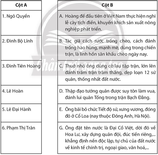 Bài tập 3 trang 42 SBT Lịch sử 7: Nối các dữ liệu ở cột A với dữ liệu ở cột B cho phù hợp.