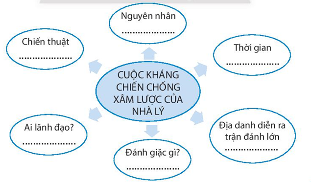 Bài tập 7 trang 47 SBT Lịch sử 7: Hoàn thành sơ đồ tư duy dưới đây về cuộc kháng chiến chống quân xâm lược Tống của nhà Lý bằng cách viết câu phù hợp vào mỗi ô trống.