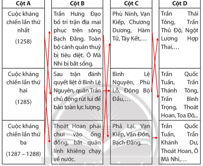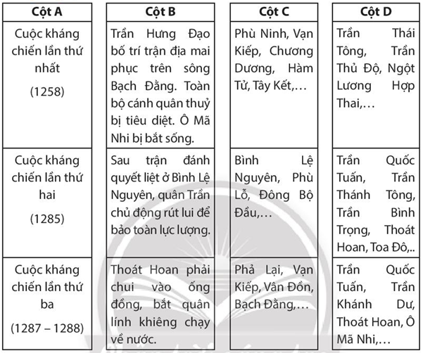 Bài tập 2 trang 54 SBT Lịch sử 7: Nối dữ liệu ở các cột A, B, C, D lại với nhau cho phù hợp để thể hiện được những nét chính của ba lần kháng chiến chống quân xâm lược Mông - Nguyên.