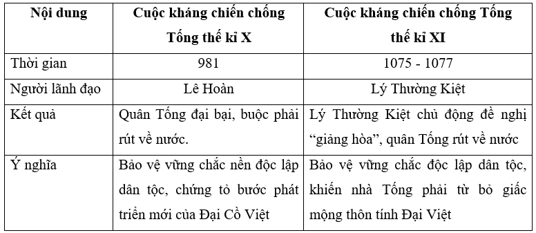 Bài tập 1 trang 42 SBT Lịch sử 7: Dựa vào kiến thức đã học, hãy lập và hoàn thành bảng (theo mẫu dưới đây) để làm rõ những điểm khác nhau giữa hai cuộc kháng chiến chống Tống thế kỉ X và thế kỉ XI.