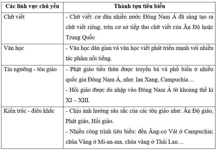 Bài tập 1 trang 26 SBT Lịch sử 7: Hãy lập và hoàn thành bảng theo mẫu dưới đây về những thành tựu văn hóa tiêu biểu trên các lĩnh vực chủ yếu của các quốc gia Đông Nam Á từ nửa sau thế kỉ X đến đầu thế kỉ XVI.